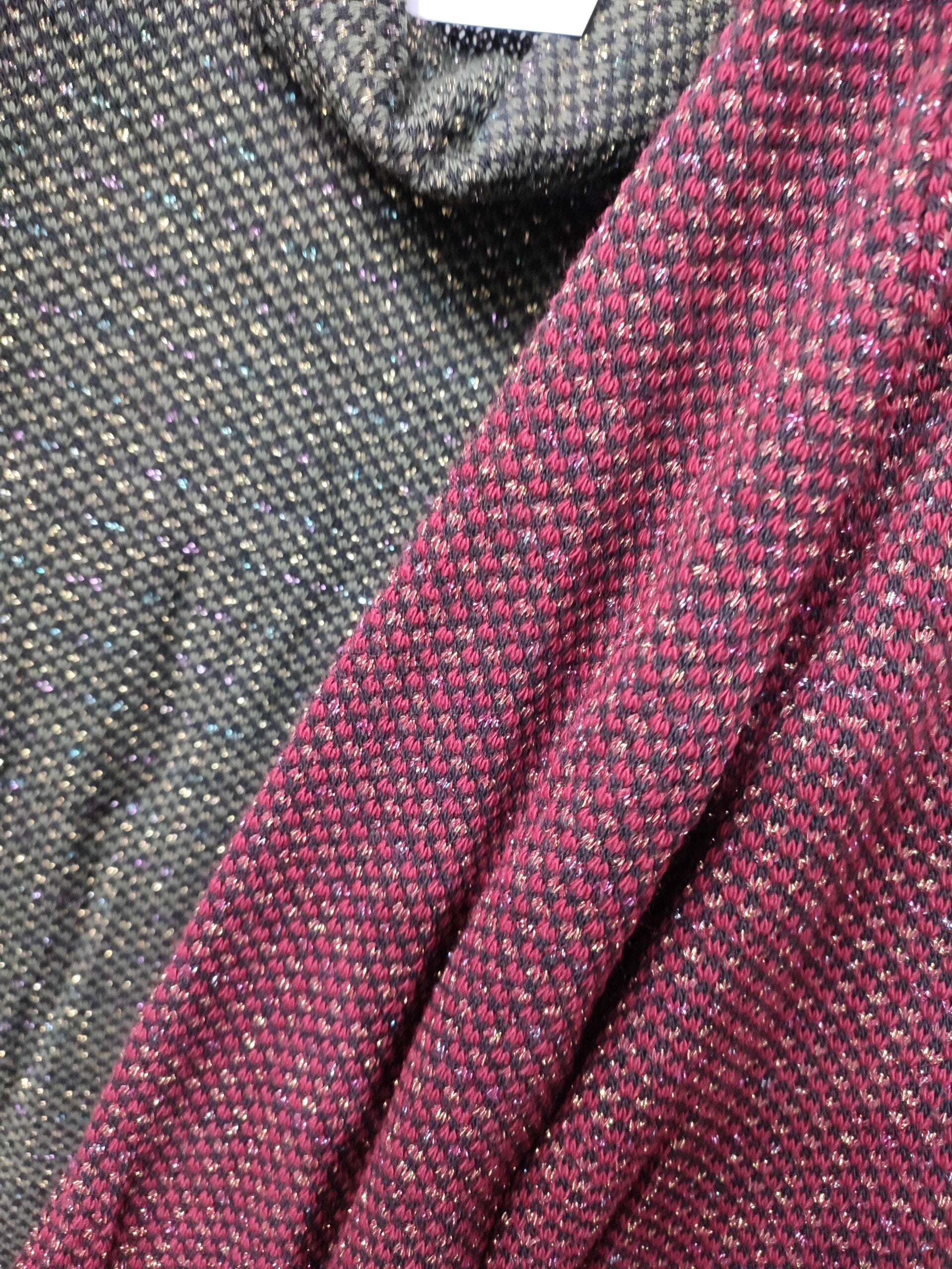 MAGLIA CIAMBELLA LUREX felpata acrilico 50,viscosa 25, poliestere 20, elastan 5. Giroseno fino a cm 123,fianchi fino a cm 140, lunghezza cm 80.scollo a ciambella. Taglio a trapezio. Costine. Punto luce lurex. Vestibilità fino alla taglia 56 abbondante.