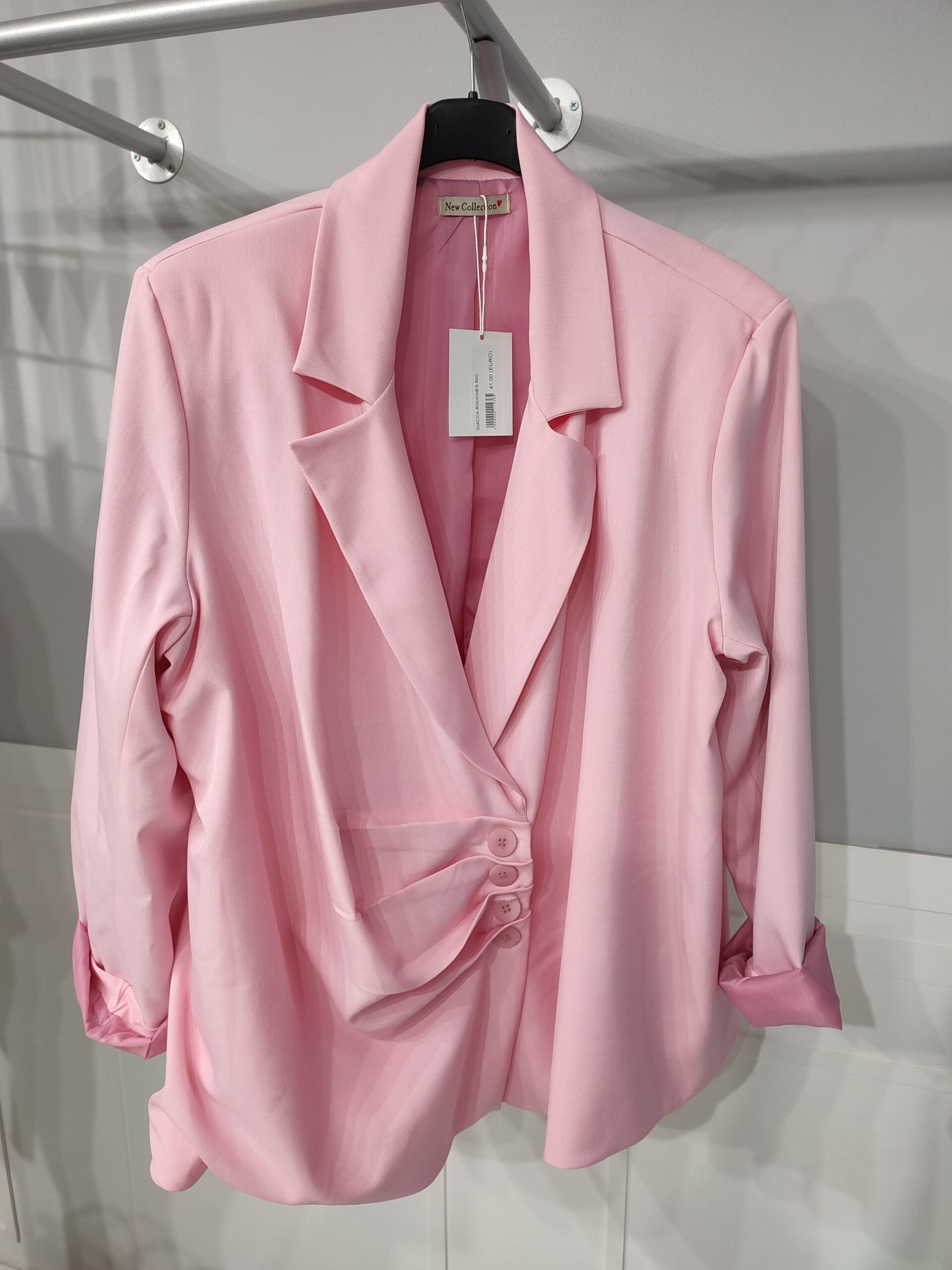 GIACCA ROUCHES RIO, poliestere 90,elastan 10 foderata. Larghezza cm 130,lunghezza cm 85.svollo reverse. Abbottonatura con pinces e quattro bottoni. Vestibilità fino alla taglia 56 comoda